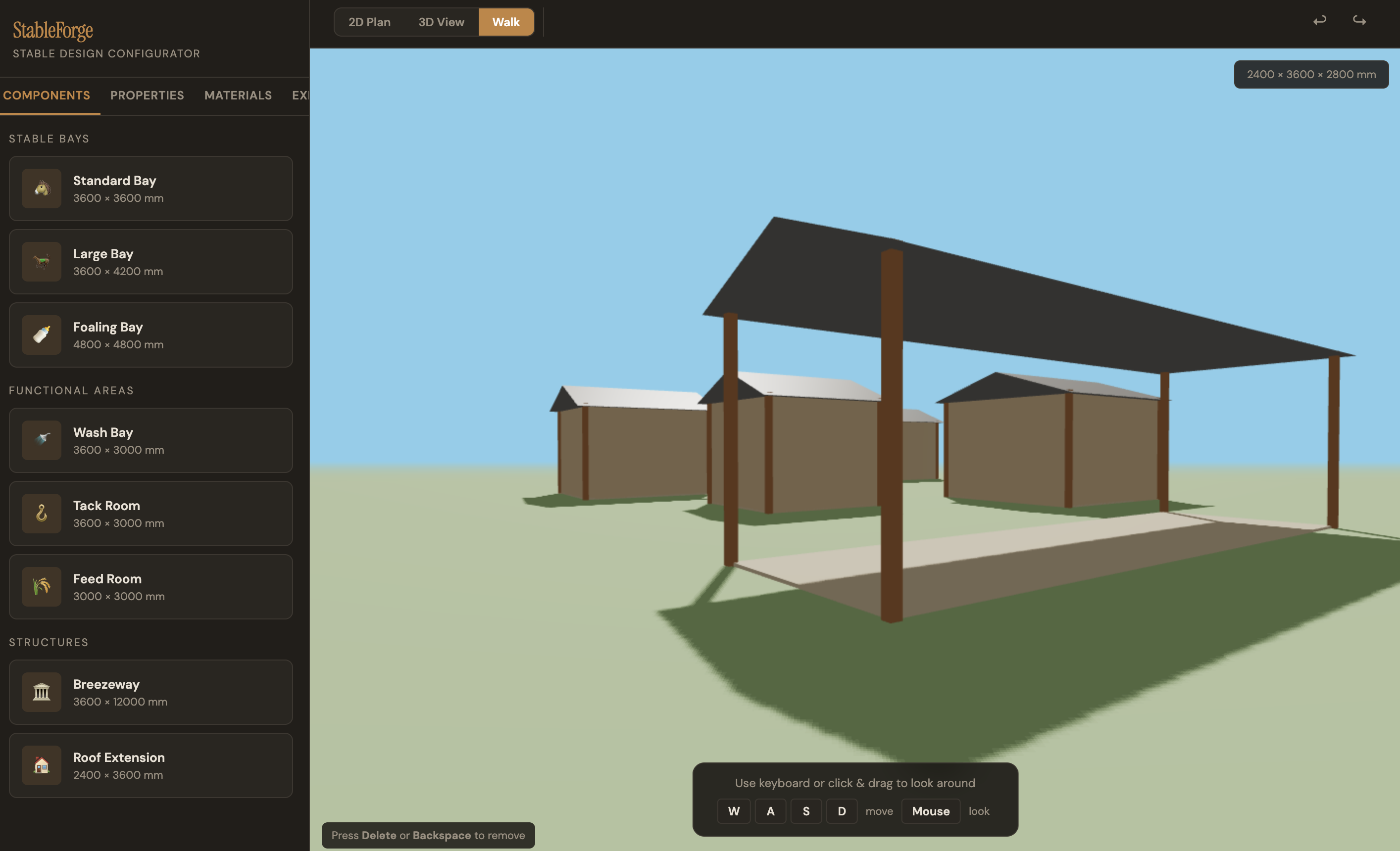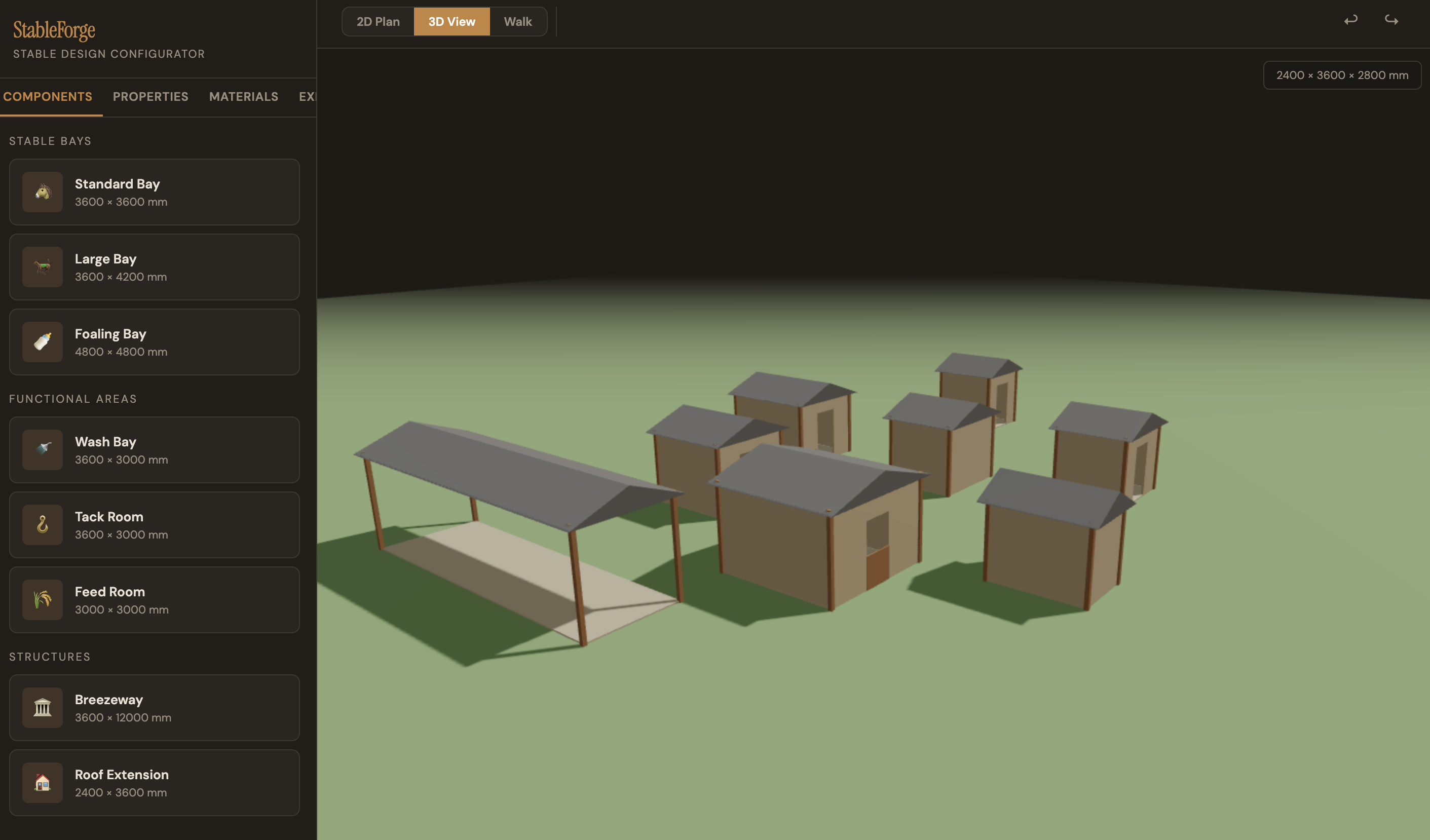 Built an interactive stable planning tool with synchronized 2D plan and 3D view workflows.